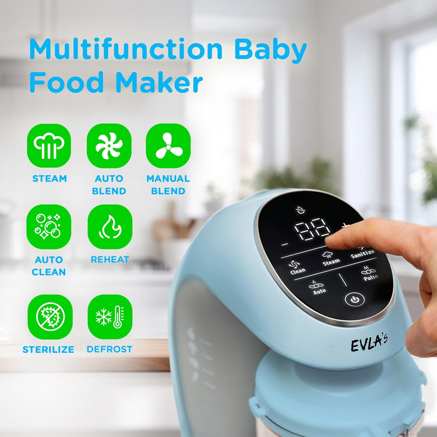 EVLA'S Baby Food Maker, Steamer, Blender, Baby Food Processor for Healthy Homemade Baby Food in Minutes, Touch Screen with 6 Reusable Food Pouches, Baby Registry Essential, Blue