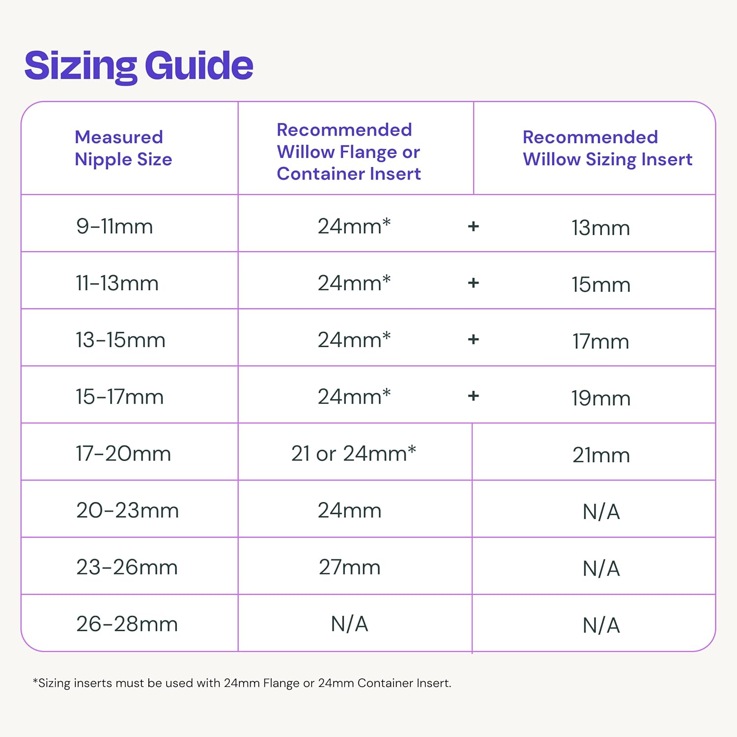 - Find Your Perfect Fit: Flanges are available in 3 sizes: 21mm, 24mm, and 27mm; Reference Willow's size chart to determine your size for an optimal pumping experience
