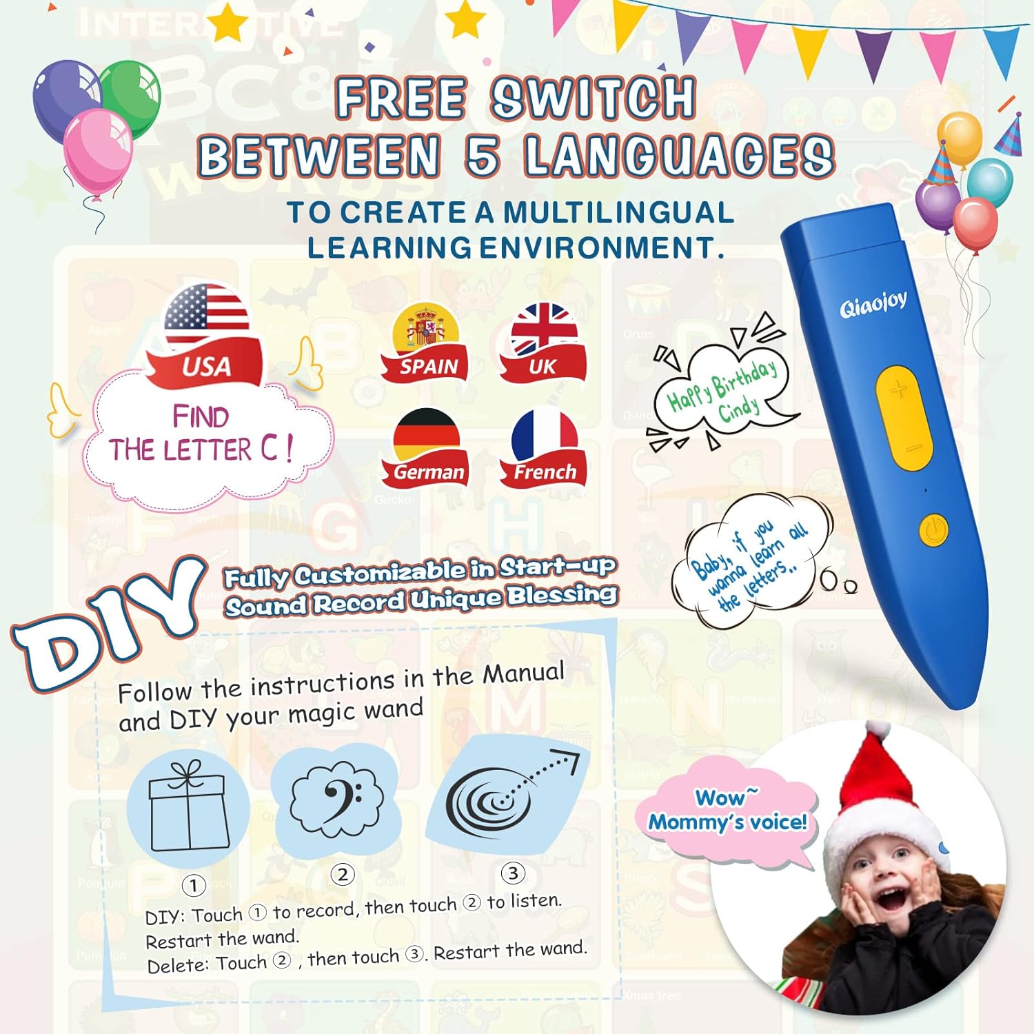 - 【RICH LEARNING RESOURCES】- Alphabet Poster contain 56 talking cards (4 in 1 cards games) + 1 interactive talking poster(5 languages, alphabet, 100 word, 800 fun facts, 3 level games) + 1 numbers board (1-100) + 1 magic wand (with recording function)